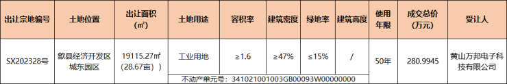 歙县1宗工业用地成交