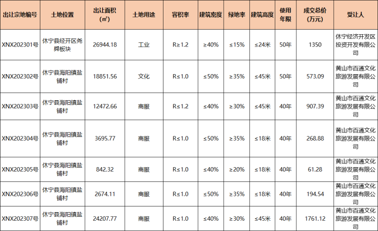 休宁县5宗商服用地、1宗工业用地、1宗文化用地成功出让