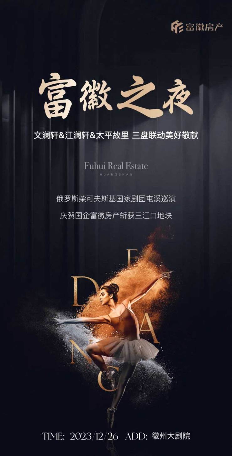 富徽之夜,文澜轩&江澜轩&太平故里三盘联动美好敬献!俄罗斯柴可夫斯基国家剧团屯溪巡演,庆贺国企富徽房产斩获三江口地块,时间:2023.12.26,地点:徽州大剧院。…
