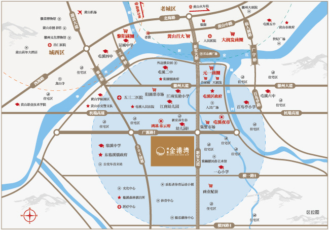 鸿基金港湾位于屯溪新安大道与广源路交汇口,处休屯双城主动脉之上,政府规划重点区域,距离市中心百大商圈仅3KM,享市芯繁华。