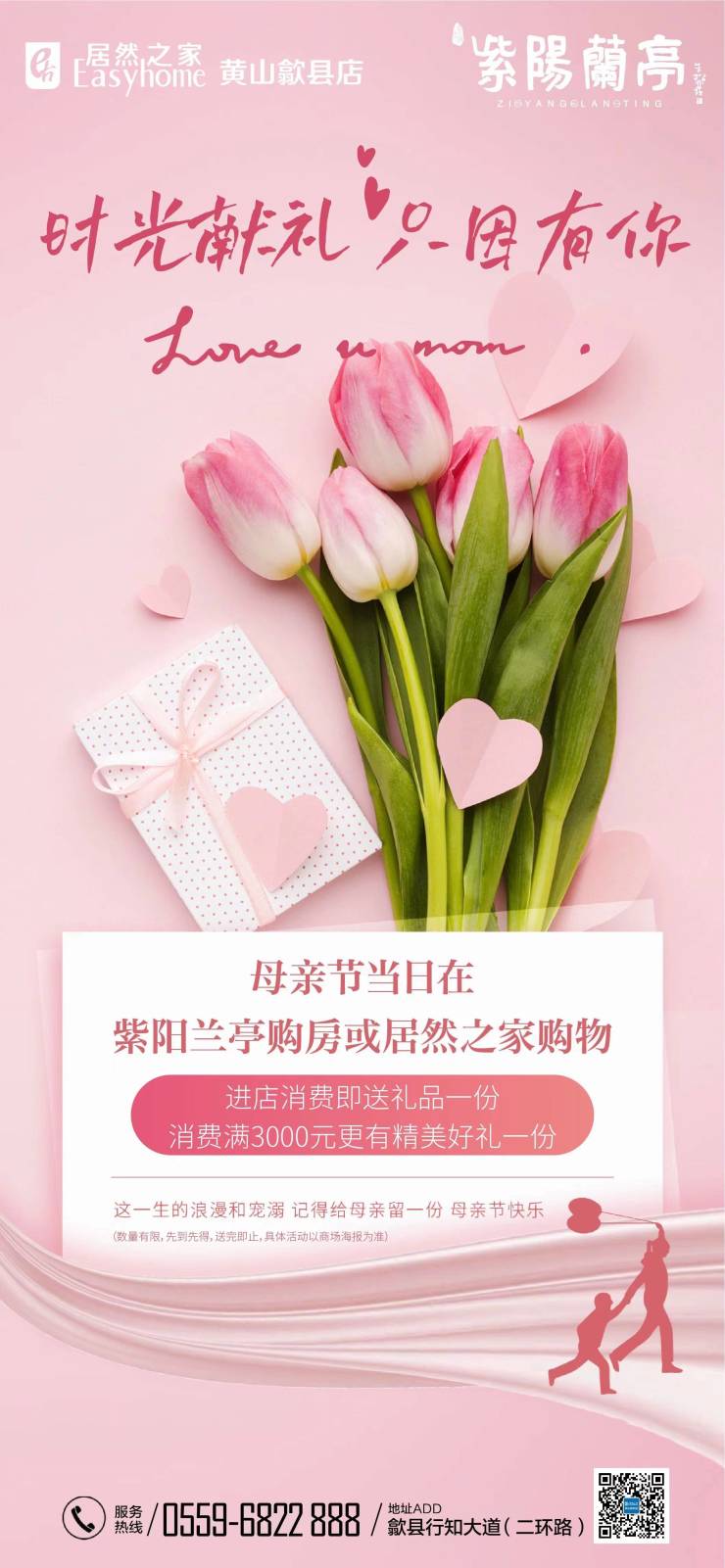 时光献礼,只因有你!母亲节当日在紫阳兰亭购房或居然之家购物,进店消费即送礼品一份,消费满3000元更有精美好礼一份。这一生的浪漫和宠溺,记得给母亲留一份母亲节快乐。(数量有限,先到先得,送完即止,具体活动以商场海报为准)