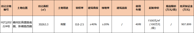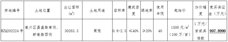 2023年1月13日,徽州区HZQ202224号地块商服用地挂牌出让,出让面积30263.3㎡(合45.35亩),起始价1500元/㎡(100万/亩),容积率0.8-2.5,拍卖时间:2023年2月13日15时30分。