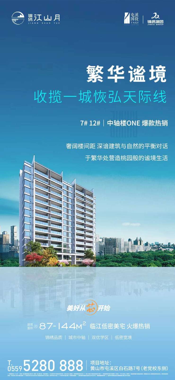 锦绣江山月,深谙建筑与自然的平衡对话,奢阔楼间距,于繁华处营造桃园般的谧境生活。7#、12#楼中轴楼ONE,爆款热销中,建面约87-144㎡,均价12500元/㎡。