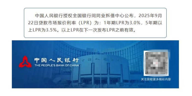 中国人民银行授权全国银行间同业拆借中心公布,2025年9月22日贷款市场报价利率(LPR)为:1年期LPR为3.0%,5年期以上LPR为3.5%。以上LPR在下一次发布LPR之前有效。