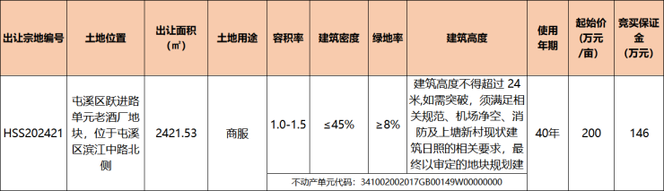2024年11月7日,屯溪区跃进路单元老酒厂地块挂牌,宗地编号:HSS202421,地块位于屯溪 区滨江中路北侧,性质为商服用地,总出让面积2421.53㎡(合3.6亩),起始总价726.459 万元、单价为 3000 元/ ㎡(200 万元/亩),拍卖时间:2024年12月9日15:30分。