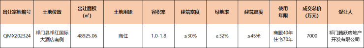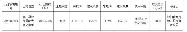 11月22日,祁门县祁红国际大酒店南侧商住地块底价成交,由祁门腾跃房地产开发有限公司竞得,成交总价7000万元,成交面积48925.06㎡(合73.39亩)。