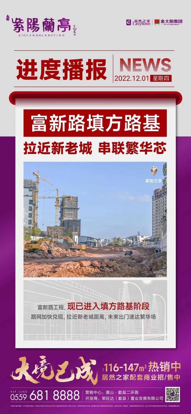 一条富新路,串联繁华场。现整个道路工程已进入填方路基阶段,路网加快兑现,拉近新老城距离,未来出门速达繁华场。紫阳兰亭,大境已成,建面约116-147㎡新品热销中,居然之家配套商业同步招/售中。