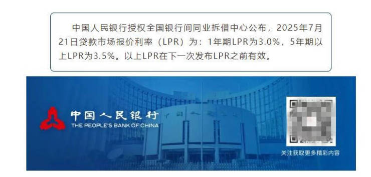 中国人民银行授权全国银行间同业拆借中心公布,2025年7月21日贷款市场报价利率(LPR)为:1年期LPR为3.0%,5年期以上LPR为3.5%。以上LPR在下一次发布LPR之前有效。来源:中国人民银行…