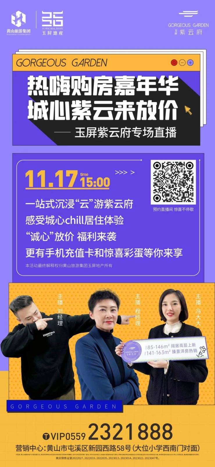 热嗨购房嘉年华,城心紫云来放价——玉屏紫云府专场直播开播啦!11月17日15:00,带你一站式沉浸“云”游紫云府,感受城心chill居住体验,“诚心”放价,福利来袭,更有手机充值卡和惊喜彩蛋等你来享。…