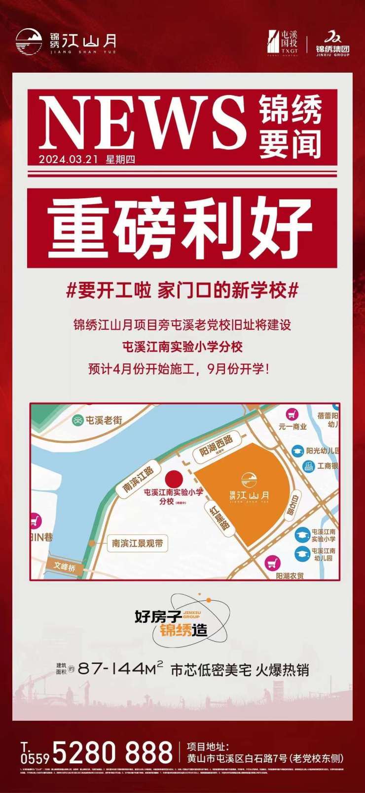 重磅利好!目送式上学,护航成长。锦绣江山月项目旁屯溪老党校旧址将建设屯溪江南实验小学分校,预计4月份开始施工,9月份开学!锦绣江山月建面约87-144㎡市芯低密美宅热售中,均价12500元/㎡。暖春购房,钜惠四重好礼:来访礼,来访送好礼;认购礼,暖春认购优惠放肆享;签约礼 ,按时签约即享砸金蛋赢家电;安家礼,春日特惠房源限时抢。