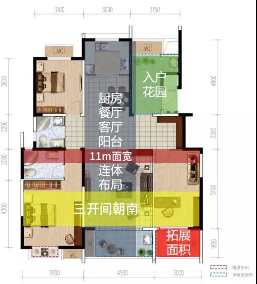 配置了入户花园,引美景入室,厨房、餐厅、客厅、阳台连体布局,减少面积浪费,空间利用的恰到好处。其次,三开间朝南设计,约11米的面宽,较大程度的拉阔观景视野及采光,实现空间尺度的延伸,使得起居待客皆从容有度。该户型享有高拓展空间,未来可根据家庭成长需求,三房变四房,灵动组合,随心打造。