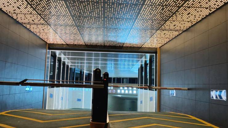 车库入口上方,打造了一个极具美感的星空穹顶,还延续到地下入户,氛围感拉满;而且地库地面也采用橘皮环氧地坪,既美观又实用。