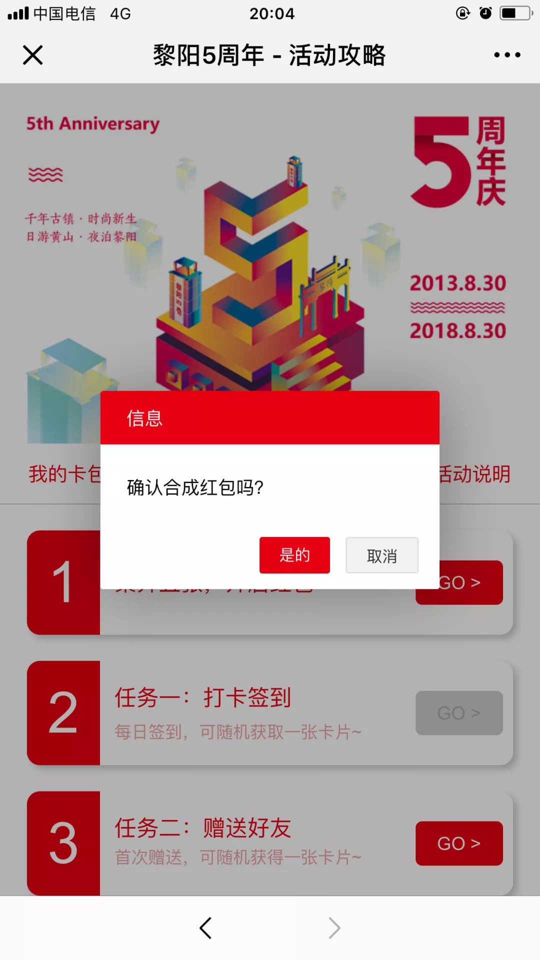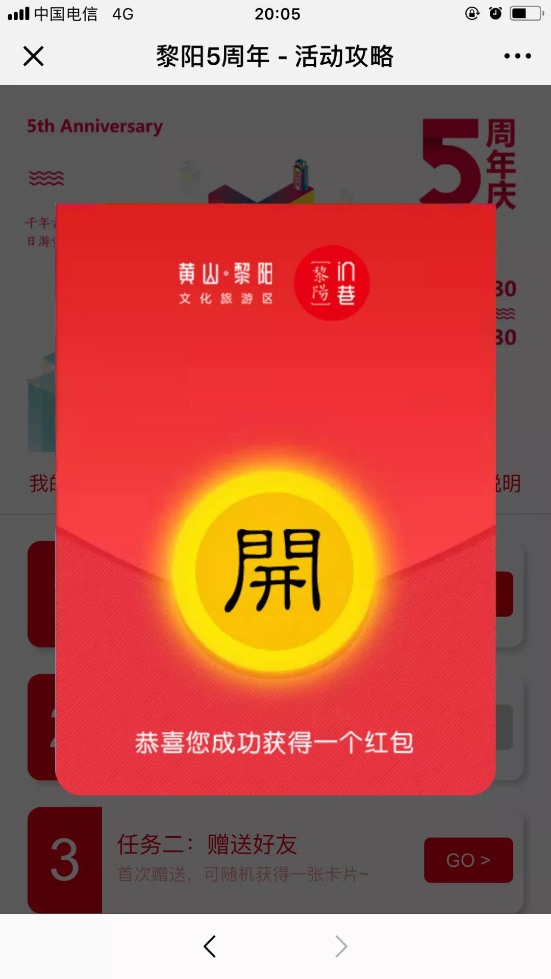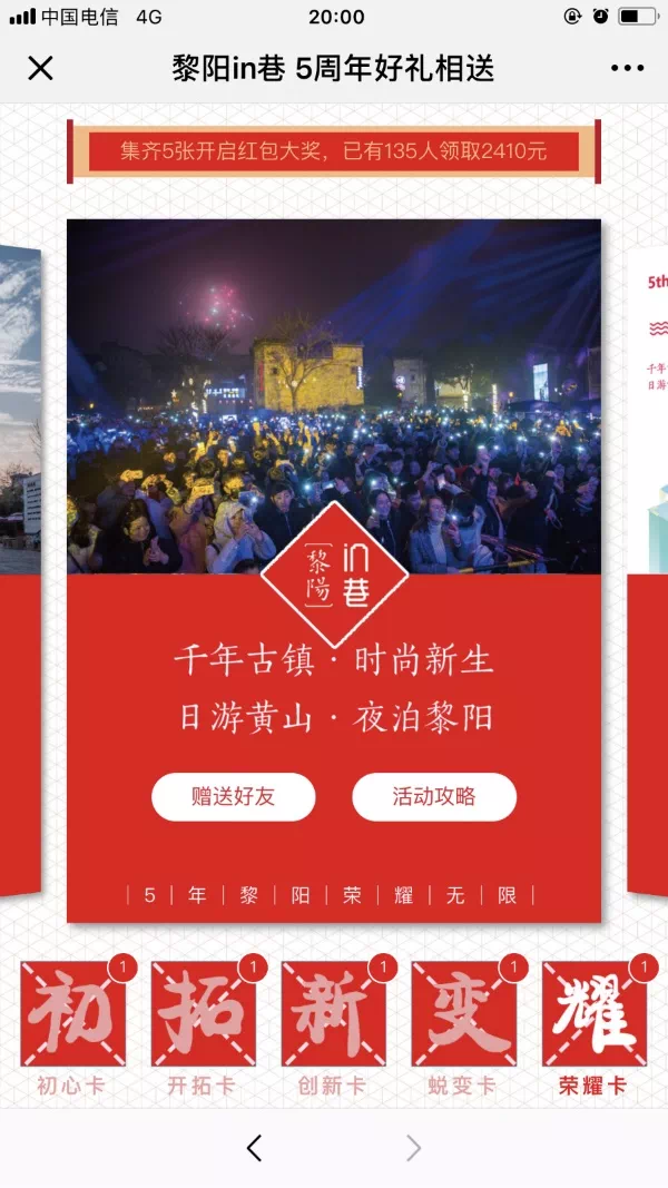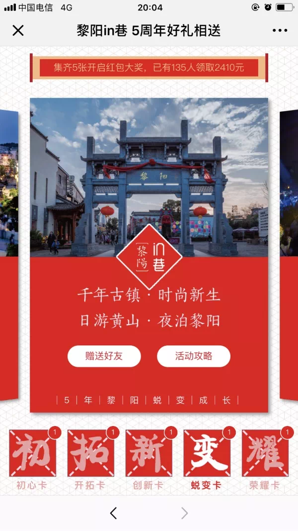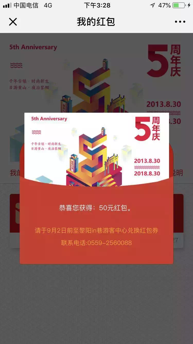 ▷ 奖品为黎阳五周年庆5元、50元红包卡,500元商家消费卡