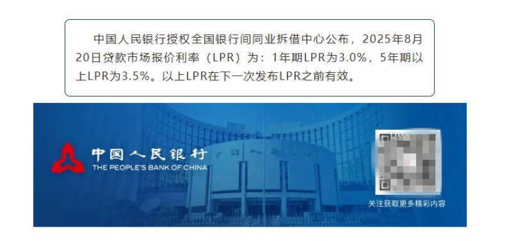 中国人民银行授权全国银行间同业拆借中心公布,2025年8月20日贷款市场报价利率(LPR)为:1年期LPR为3.0%,5年期以上LPR为3.5%。以上LPR在下一次发布LPR之前有效。