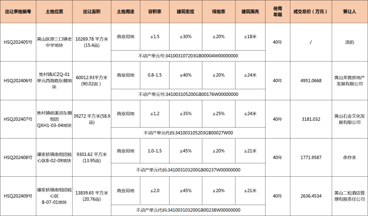 黄山区4宗商业用地成功出让,1宗商业用地流拍