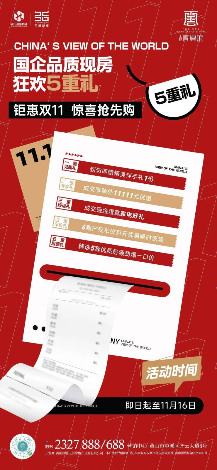 国企品质现房,狂欢5重礼。玉屏齐云府,钜惠双11 惊喜抢先购,五重购房礼遇,等你来安家。活动时间:截止至11月16日
