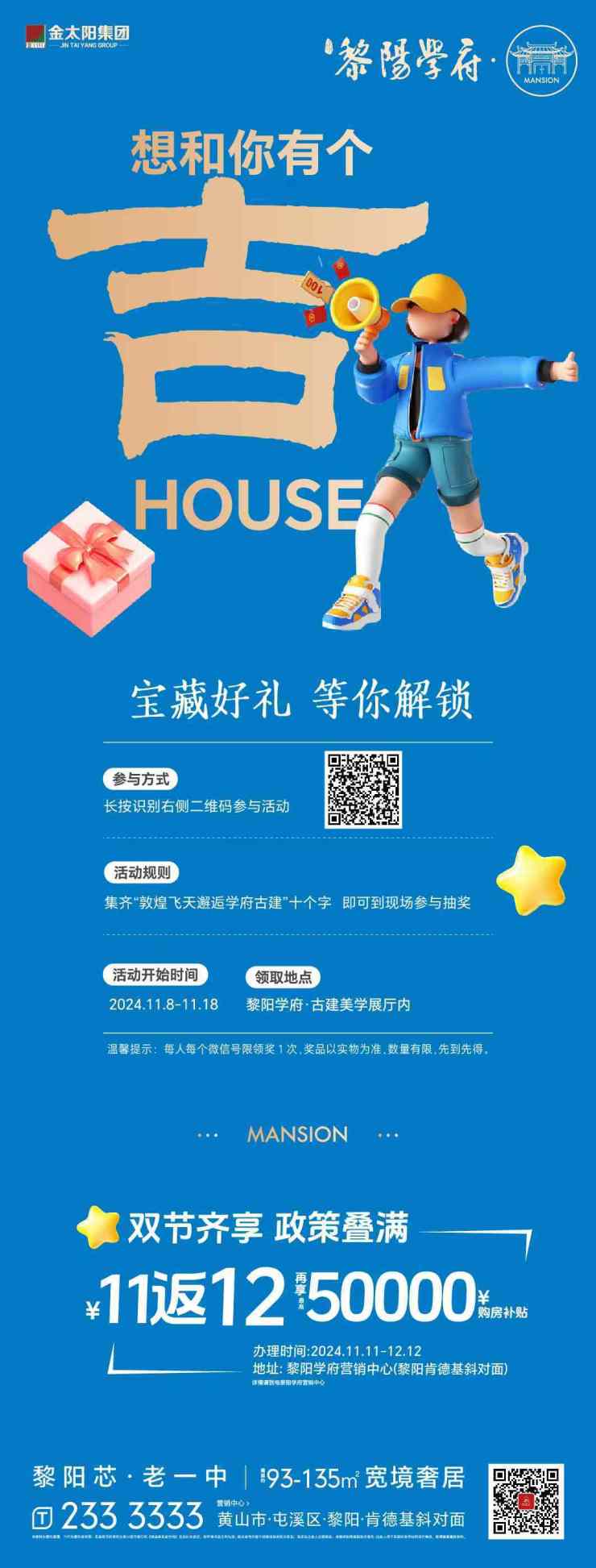 想和你有个吉,黎阳学府集字寻宝,宝藏好礼等你解锁。活动规则:集齐“敦煌飞天邂逅学府古建”十个字 即可到现场参与抽奖;活动开始时间:11月8日-18日;领取地点:黎阳学府·古建美学展厅内。