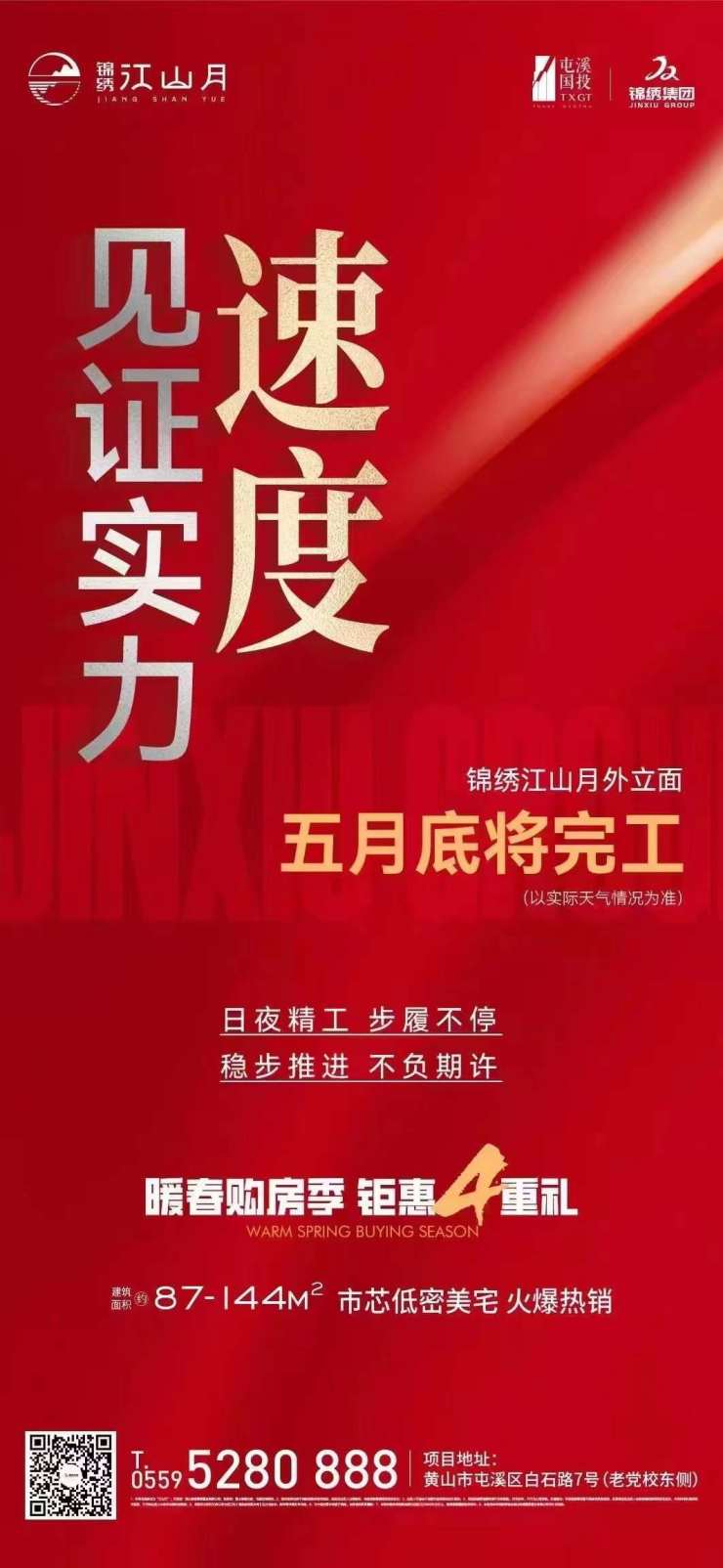 日夜精工,步履不停,稳步推进,不负期许。锦绣江山月外立面五月底将完工。暖春购房,钜惠四重好礼:来访礼,来访送好礼;认购礼,暖春认购优惠放肆享;签约礼 ,按时签约即享砸金蛋赢家电;安家礼,春日特惠房源限时抢。建面约87-144㎡市芯低密美宅热售中,均价12500元/㎡。