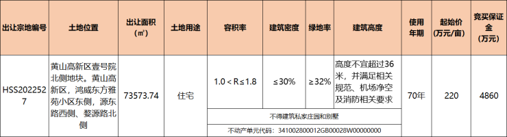 2025年8月18日,黄山高新区壹号院北侧住宅地块(宗地编号:HSS202527)挂牌,宗地位于黄山高新区,鸿威东方雅苑小区东侧,源东路西侧、婺源路北侧。出让总面积73573.74㎡(合110.36亩),起始总价24279.3342万元,起始单价3300元/㎡(220万元/亩),容积率1.0<R≤1.8,起拍楼面地价1833.33元/㎡,地块要求不得建筑私家庄园和别墅。拍卖时间:2025年9月19日15时30分。
