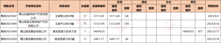 2023年8月,黄山中心城区黎阳学府、江南锦园、玉屏紫云府、玉屏齐云府4盘加推入市,共计339套房源。