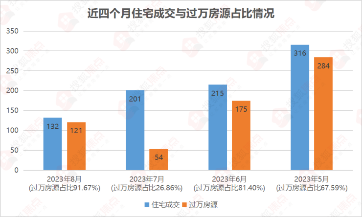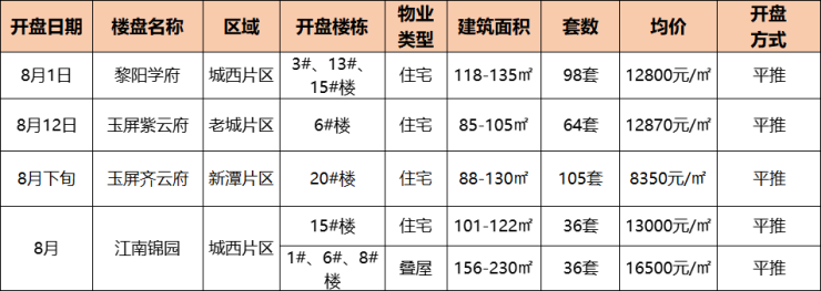 8月黎阳学府、江南锦园、玉屏紫云府、玉屏齐云府先后加推入市,共计303套住宅房源,四盘平均去化率仅22.77%,新房去库存压力加大。整体市场普通住宅成交132套,其中过万房源成交121套,占比约91.67%,相较于7月的26.86%,大幅上涨64.81%,市场再次回归核心区域。普通住宅成交均价12000元/㎡,对比上月的9500元/㎡,结构性回升。