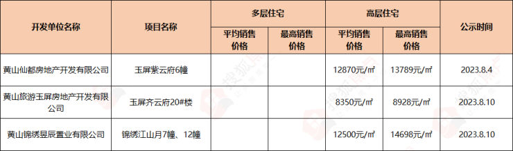 2023年8月,黄山中心城区玉屏紫云府、玉屏齐云府、锦绣江山月3盘获备案价。其中,玉屏紫云府北区6#楼备案均价12870元/㎡,较之前的13400元/㎡,备案价下调530元/㎡;锦绣江山月7#、12#楼备案均价12500元/㎡,与首开备案价持平;玉屏齐云府六期20#楼备案均价8350元/㎡。