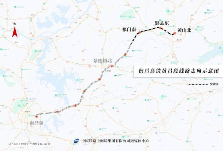 杭昌高铁黄昌段(安徽段)是杭州至南昌高铁重要组成部分,起自江西省南昌市,途经江西省上饶市、景德镇市,东至安徽省黄山市,全长约290公里,沿线设南昌东、进贤北、余干、鄱阳、乐平北、景德镇北、浮梁东、祁门南、黟县东、黄山北10座车站,设计时速350公里。