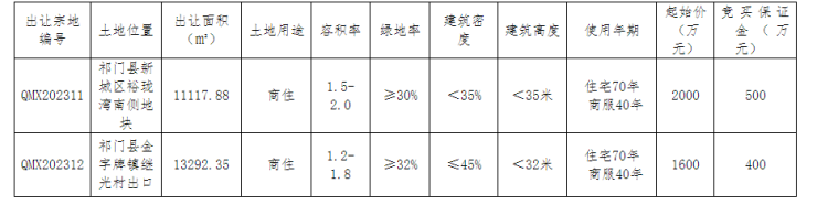 2023年6月15日,祁门县新城区裕珑湾南侧地块(宗地编号:QMX202311)、祁门县金字牌镇继光村出口地块(宗地编号:QMX202312)2宗商住用地挂牌出让。其中,QMX202311地块总出让面积11117.88㎡(合16.67682 亩),起拍总价2000万元,起拍楼面地价899.45元/㎡;QMX202312地块总出让面积13292.35㎡(合19.938525 亩),起拍总价1600万元,起拍楼面地价668.72元/㎡ ,拍卖时间:2023 年 7 月 21 日 10 时 00 分。