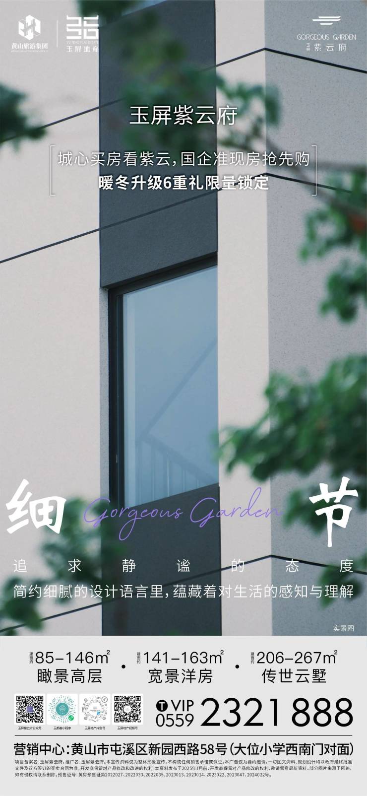 细节,追求精密的态度,简约细腻的设计语言里,蕴藏着对生活的感知与理解。城心买房看紫云,国企准现房抢先购暖冬升级6重礼限量锁定。玉屏紫云府,建面约85-146㎡瞰景高层、建面约141-163㎡宽景洋房、建面约206-267㎡传世云墅热售中。