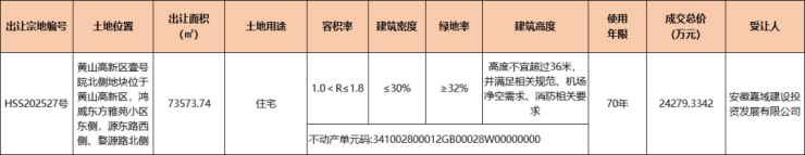 2025年9月,黄山高新区壹号院北侧住宅地块(宗地编号:HSS202527)成交,由安徽嘉域建设投资发展有限公司底价竞得,成交总价24279.3342万元,成交单价3300元/㎡(220万元/亩),成交楼面地价1833.33元/㎡,无溢价。