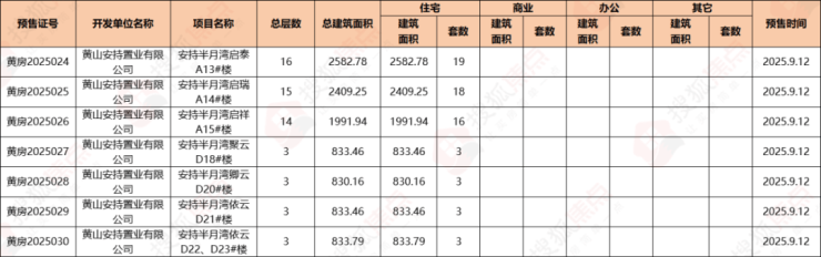 2025年9月,黄山中心城区安持半月湾1盘获预售证,新增可预售住宅房源65套。