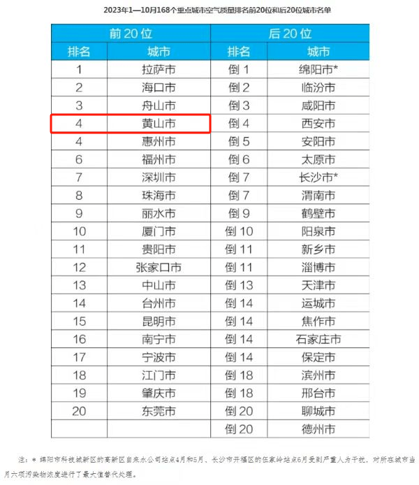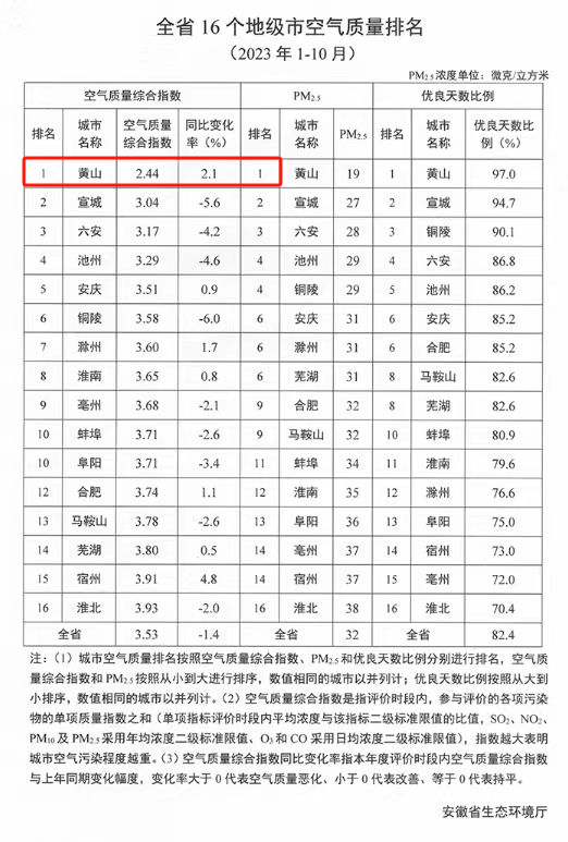 近日,生态环境部、安徽省生态环境厅发布了2023年1—10月环境空气质量状况及排名,黄山市空气质量排名全国168个重点城市第4位、全省16个地级市第1位,PM2.5浓度及优良天数比例均排名全省第一。