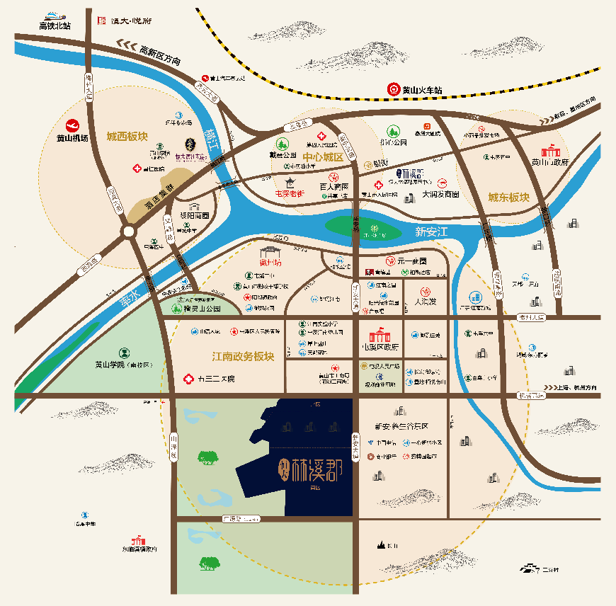 恒大林溪郡位于黄山城南,江南新区呈井字形交通道路网,出门即公交站、直达城市中心,尽享百大、大润发、黎阳三大商圈,置业恒大林溪郡,机场,高铁,汽车客运、公交一应俱全,出行无忧。