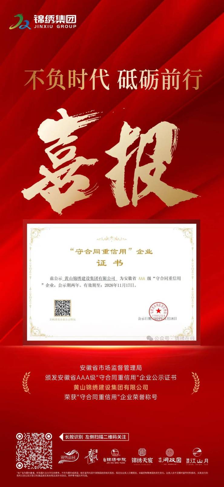 喜报!黄山锦绣建设集团荣获3A级“守合同重信用”企业称号