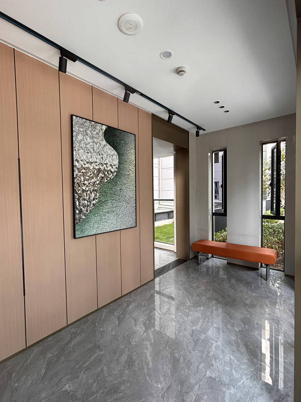 • 单元入户厅:不再是冰冷的电梯间。装饰壁画赋予艺术感,造型别致的艺术凳让等电梯的片刻也变得浪漫,归家仪式感从这里延续。