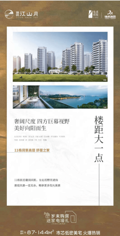 奢阔尺度,四方巨幕视野,美好向阳而生!锦绣江山月11栋前后奢阔间距,左右视野无遮挡,景观风景一览无余,畅享更多阳光美景。建面约87-144㎡市芯低密美宅热售中,均价12500元/㎡。岁末购房,送家电壕礼。