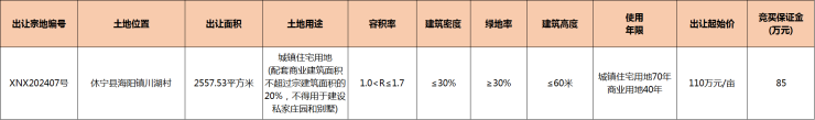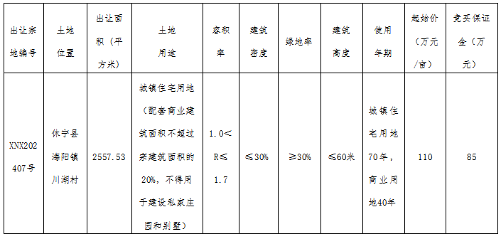 2025年5月6日,休宁县海阳镇川湖村1宗住宅用地(宗地编号:XNX202407号)挂牌出让,出让面积2557.53㎡(3.84亩),容积率1.0<R≤1.7(配套商业建筑面积不超过宗面积的20%,不得用于建设私家庄园和别墅),起始出让总价422.4万元,土地单价为110万元/亩(1651.59元/㎡),起拍楼面地价971.52元/㎡。拍卖时间:2025年6月4日15时30分。