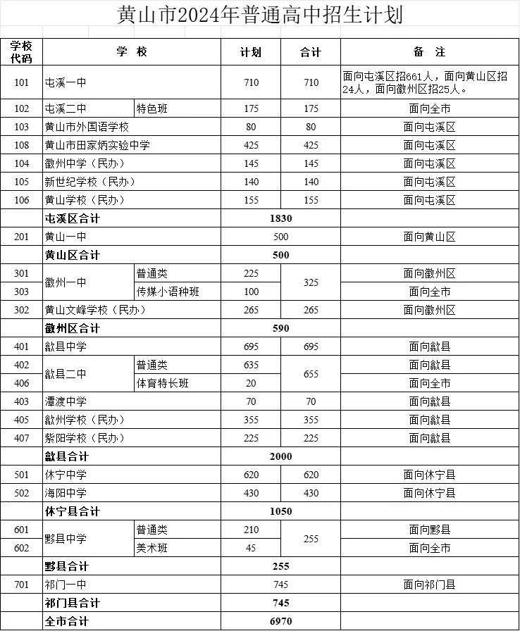 根据《安徽省教育厅关于做好2024年普通中小学招生入学工作的通知》(皖教秘基〔2024〕67号)和《黄山市教育局关于做好2024年普通高中招生有关工作的通知》(黄教基〔2024〕9号)要求,为做好2024年普通高中招生工作,各区县结合各校办学实际,统筹制定辖区内公、民办普通高中学校招生计划。现随文下达全市2024年普通高中招生计划,请认真贯彻执行。