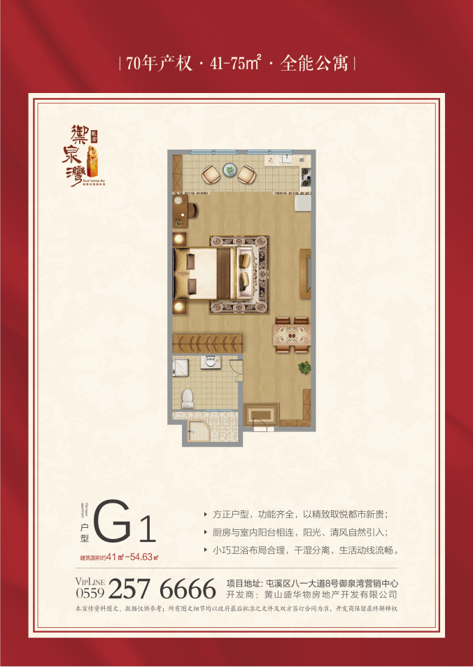 长宏御泉湾公寓建筑面积约41-54㎡,面积虽不大,但设计合理,格局方正,一室一厅一卫一阳台布局,具备起居、餐厨、卫浴等生活功能,利用率高,可谓“麻雀虽小,五脏俱全”。