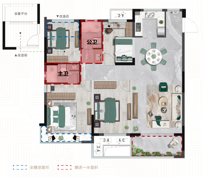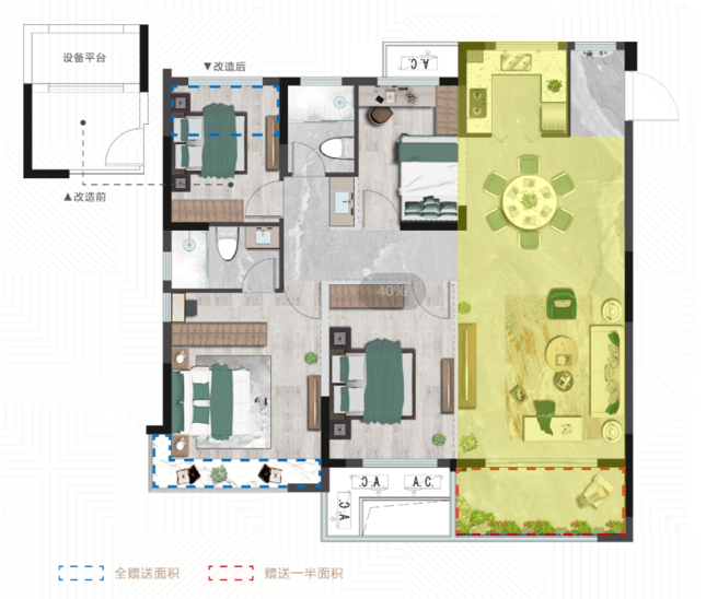 公共区 采用目前较新居住设计理念“LDK方厅”一体化布局,即餐厅、客厅、阳台无缝连接成一条线,家庭成员之间的沟通更方便, 南向客厅开间 能达到 约4.2米 ,布置家居更加随心所欲。