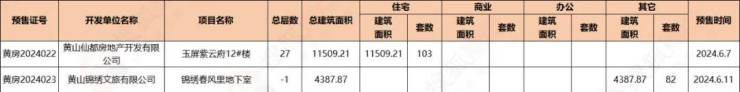 2024年6月,黄山中心城区玉屏紫云府、锦绣春风里2盘获预售证,新增可预售住宅房源103套,可预售地下室房源82套。