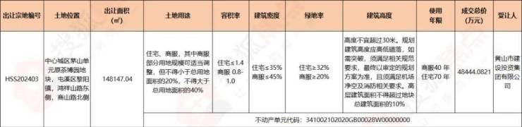 2024年6月,黄山中心城区首宗涉宅用地原茶博园地块底价成交,由黄山市建设投资集团有限公司竞得,成交总价48444.0821万元,成交面积148147.04㎡(222.22亩),成交单价3270元/㎡(218 万元/亩)。