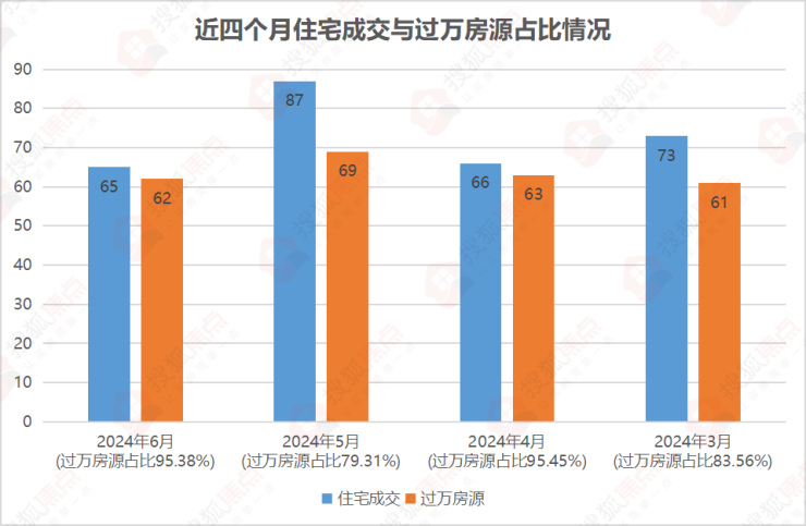 2024年6月,普通住宅成交65套,其中过万住宅房源62套,占比95.53%,核心区域热门楼盘成交占比提升,拉动住宅均价结构性上涨,住宅均价为11300元/㎡。
