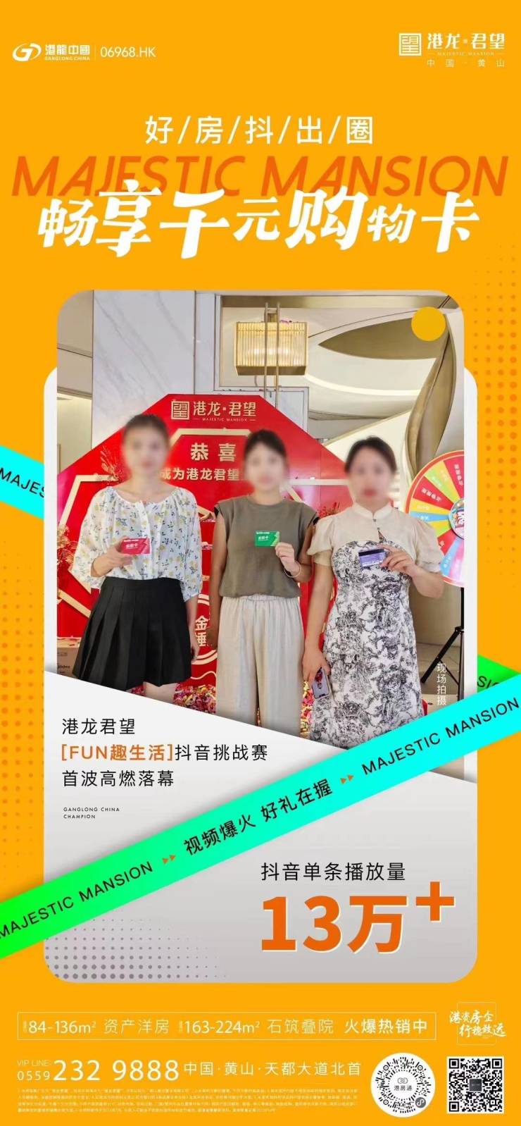 好房抖出圈,畅享千元购物卡。港龙君望,[FUN趣生活]抖音挑战赛首波高燃落幕,抖音单条播放量13万+。