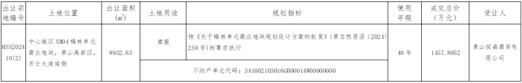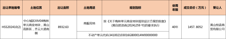 2024年11月25日,黄山中心城区XM04梅林单元商业地块成交,由黄山恒森商贸有限公司竞得,成交总价1457. 8052万元。