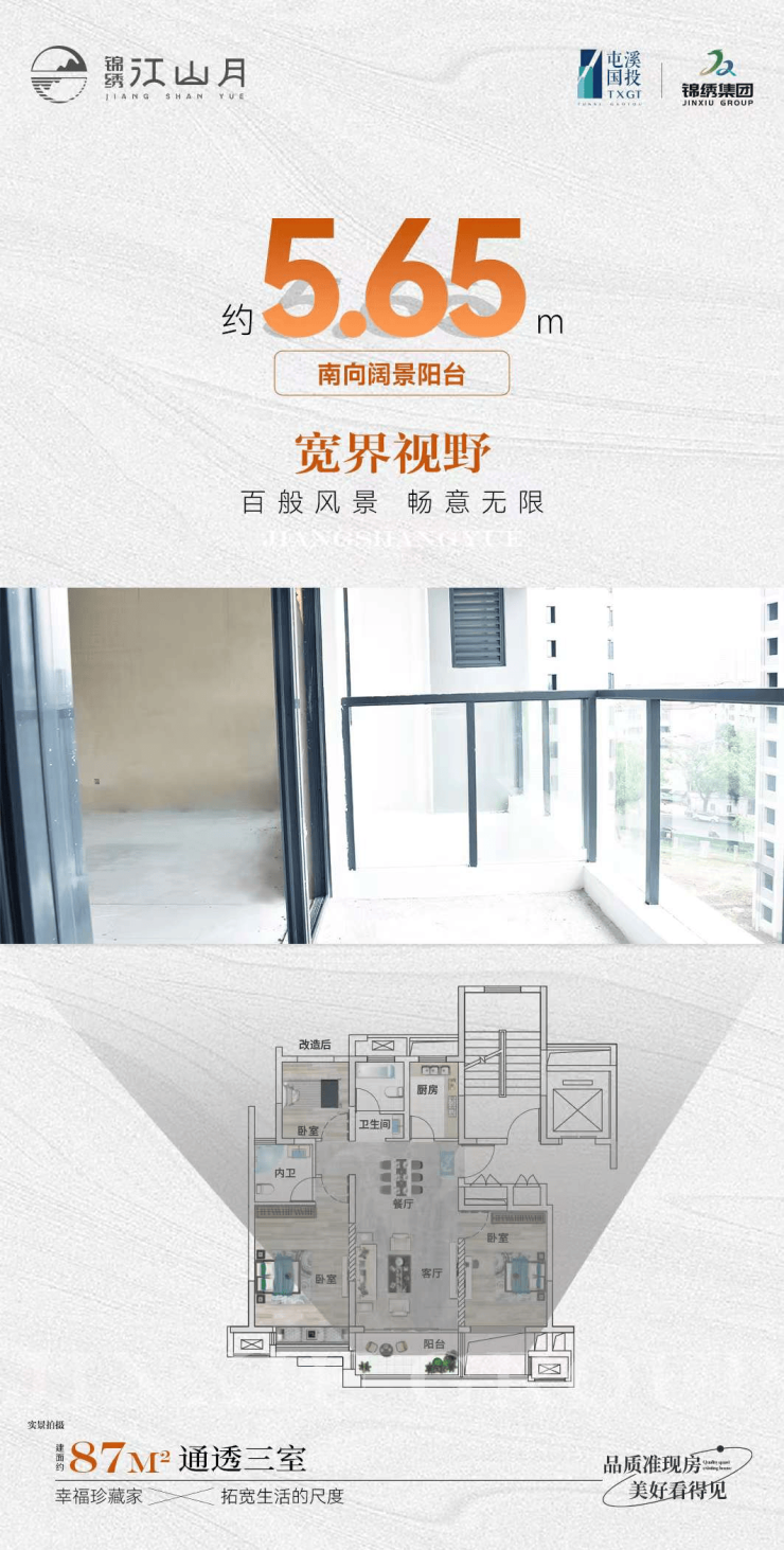 锦绣江山月建面约87㎡户型,南向约5.65㎡宽景阳台,以蓝天为顶,以自然为底,让房子成为观景台,满足居者对诗意浪漫生活的想象。