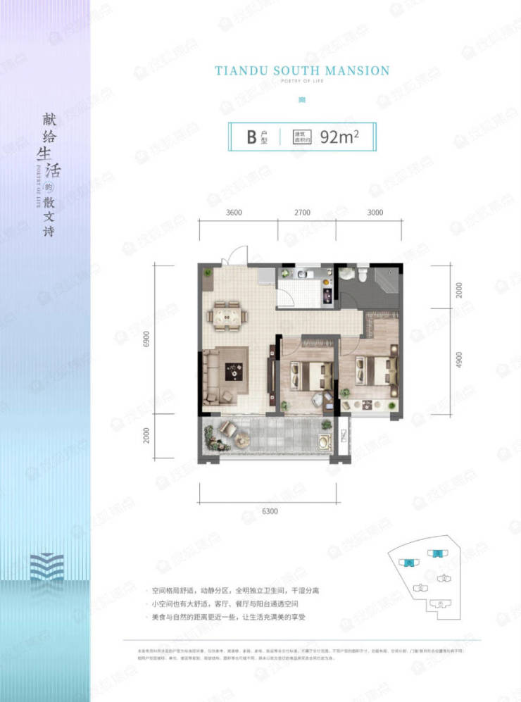 92㎡精致小户,格局方正、三开间朝南,并配备6.3米大开间观景阳台,南北通透,小空间也有大舒适。