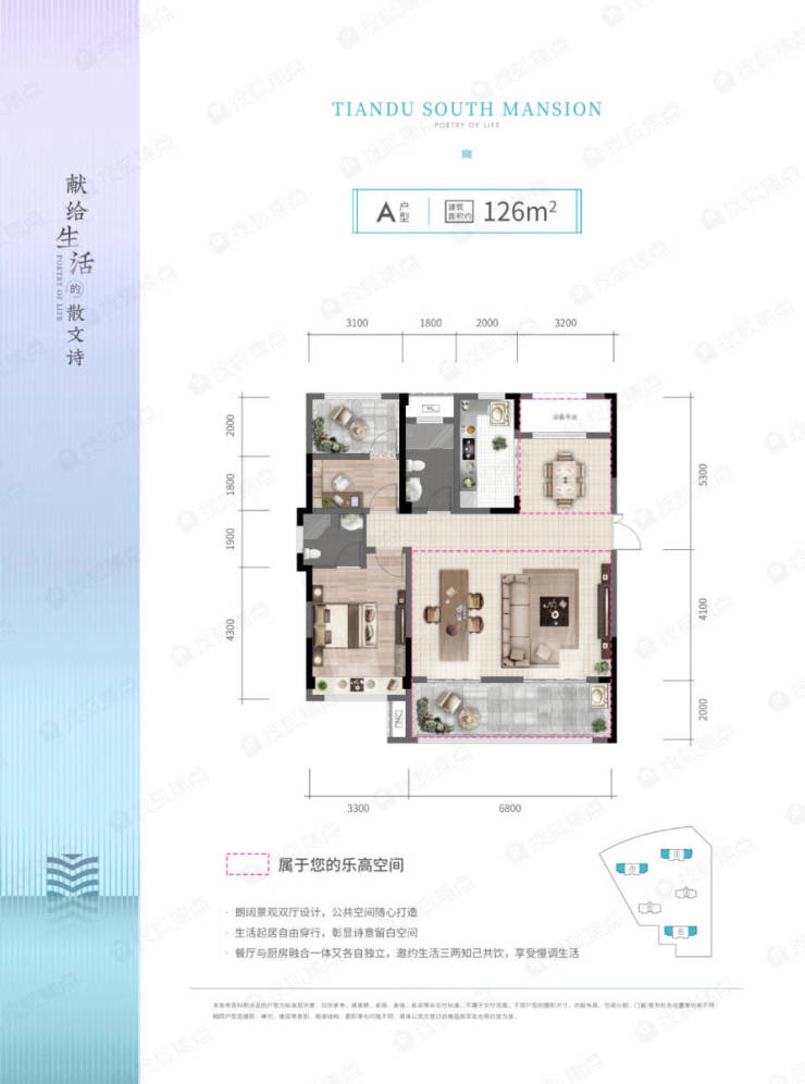 126㎡户型,朗阔双厅设计,室内面积更大,可改造空间也更多;户型格局方正,空间舒适;主卧飘窗设计,收纳四季美景;餐厅、厨房咫尺相连,美味生活加速传递。
