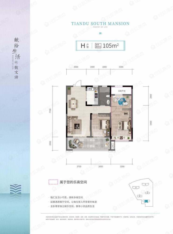 105㎡户型,格局方正,三开间朝南,配备有6.7米开间观景阳台;主卧进深达8.3米,南北贯通,空间通透明亮,可拓展性高,随心改造。120㎡户型,朗阔双厅设计,随意切换生活模式;12.6米大面宽朝南,客厅、餐厅与阳台相连,空间通透,采光充足;配备双卫,方便生活,保障私密空间。