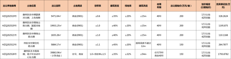 2025年11月13日,徽州区HZQ202519号、HZQ202520号、HZQ202521号、HZQ202522号、HZQ202526号用地挂牌,其中HZQ202526号地块为商住用地,位于徽州区永丰路南侧、青少年活动中心东北侧,出让面积39863.96㎡(合59.8亩),起始单价2250元/㎡(150万元/亩),起拍楼面地价1500元/㎡,起始总价8970万元。拍卖时间:2025年12月12日15时30分。